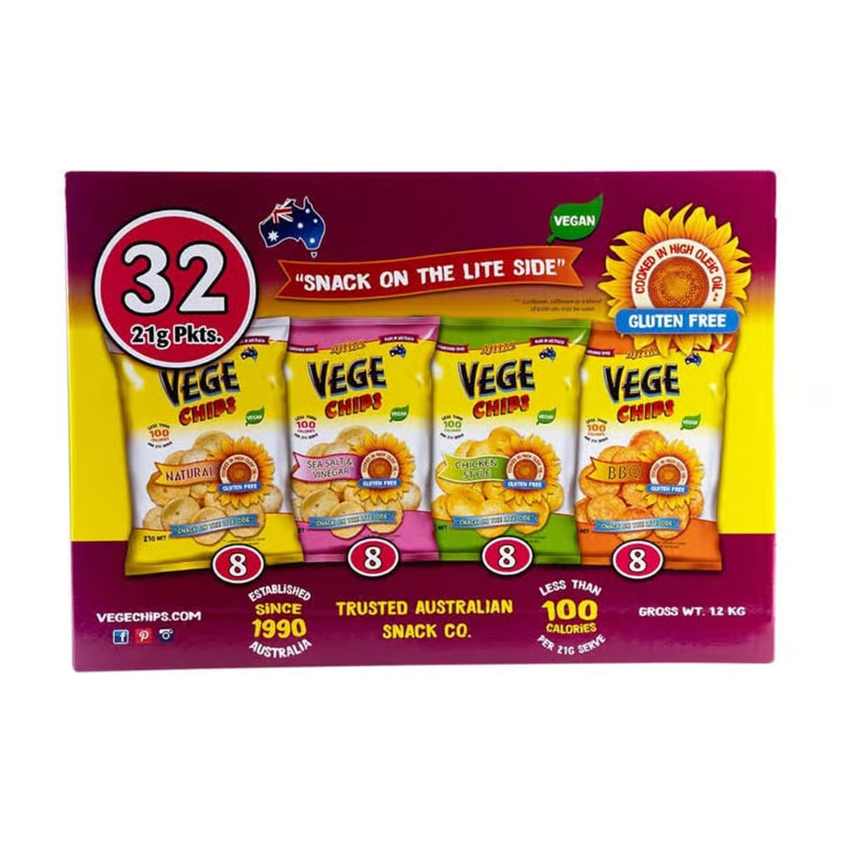 Enjoy guilt-free snacking with the Vege Chips Variety Box! This 32-pack includes 21g individual serves in four delicious, gluten-free flavours: Natural, Sea Salt & Vinegar, Chicken Style, and BBQ. Cooked in high oleic sunflower oil and made from premium ingredients, these chips are vegan-friendly and contain less than 100 calories per serve—perfect for school lunches, office snacks, or healthy munching on the go.