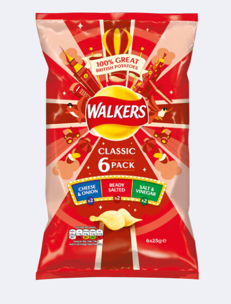 这款多包装包含以下经典口味:2 包原味咸味、2 包奶酪洋葱味和 2 包盐醋味薯片。采用 100% 英国本地马铃薯 制作,我们从中看到了无限潜力。作为英国的经典口味,这些薯片选用可持续种植的马铃薯,并使用 100% 高品质原料 精制而成,保证新鲜美味。不含添加 MSG、人工色素或防腐剂,且适合素食者享用。